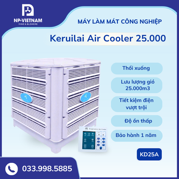 Keruilai air conditioner KD25 là lựa chọn tối ưu cho doanh nghiệp cần giải pháp làm mát công nghiệp mạnh mẽ, tiết kiệm và bền bỉ. Với lưu lượng 25.000 m³/h, tấm CELdek chất lượng cao và hai hướng thổi linh hoạt (KD25A – thổi xuống, KD25C – thổi lên), sản phẩm dễ dàng đáp ứng mọi nhu cầu từ nhà xưởng đến khu thương mại.