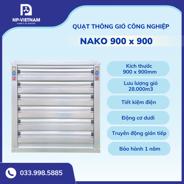 Quạt thông gió vuông 900x900 NAKO là giải pháp lý tưởng cho nhà xưởng, kho bãi, trang trại cần thông gió hiệu quả, tiết kiệm điện và bền bỉ. Với cấu tạo chắc chắn, motor lõi đồng 100%, lưu lượng gió mạnh mẽ 28.000 m³/h cùng chế độ hậu mãi tận tâm từ NP Việt Nam, sản phẩm đáp ứng trọn vẹn yêu cầu của mọi doanh nghiệp.
