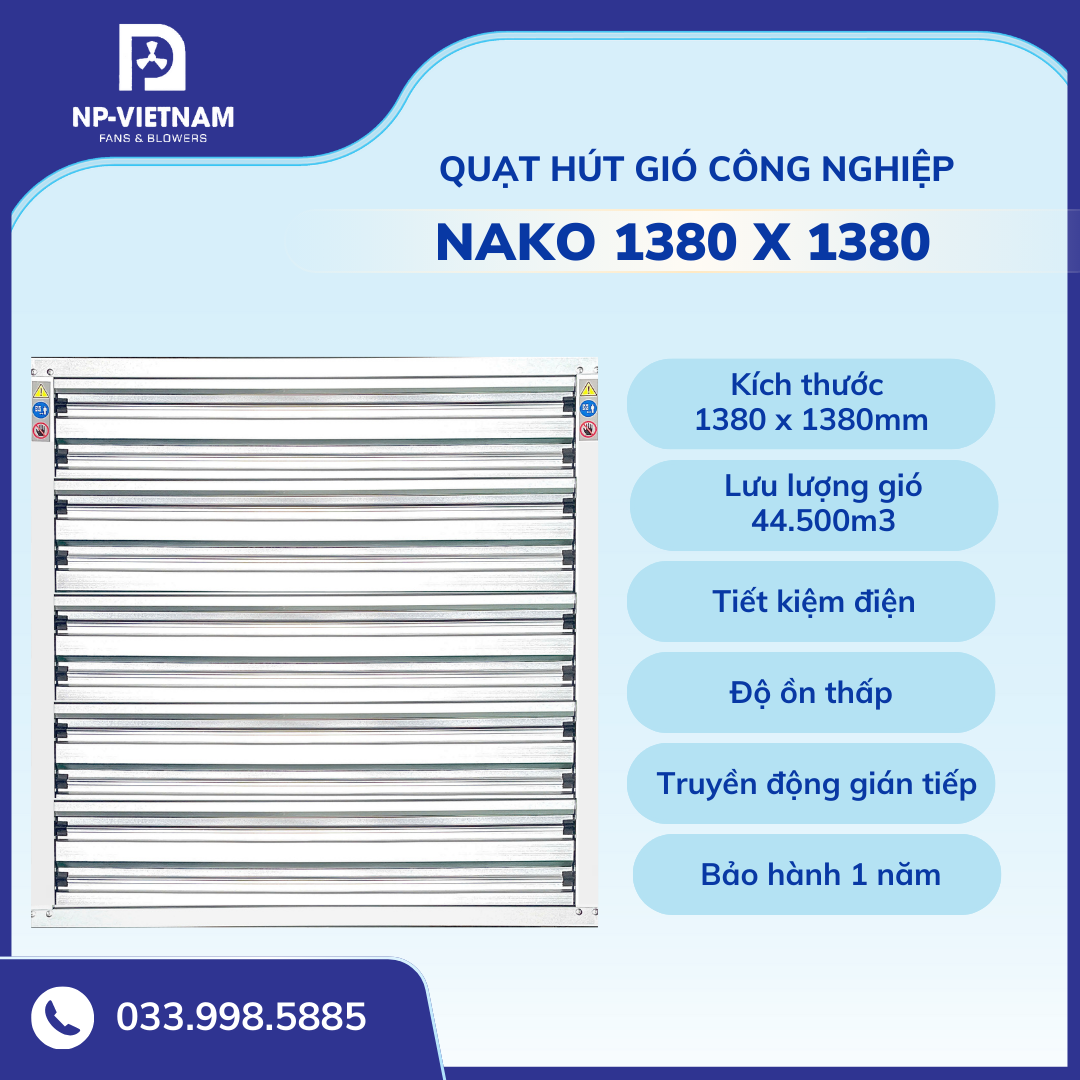Tính kinh tế và hiệu quả tổng thể: Với ưu điểm cánh inox bền bỉ, motor chất lượng, lưu lượng gió lớn và khả năng tiết kiệm điện, quạt hút công nghiệp 1380x1380 NAKO là giải pháp lý tưởng cho mọi doanh nghiệp. Sản phẩm không chỉ giúp cải thiện môi trường làm việc mà còn nâng cao năng suất lao động, bảo vệ thiết bị sản xuất.