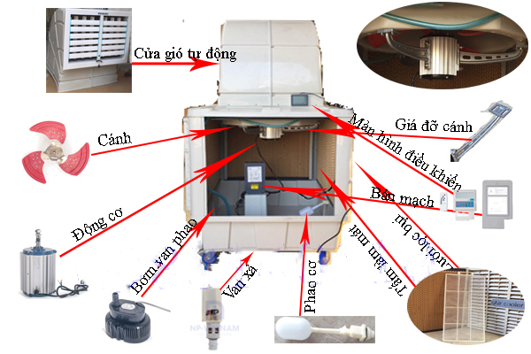 Máy làm mát không khí công nghiệp di động thiết kế thông minh, các bộ phận cấu thành nên máy có thể tháo rời tiện lợi cho việc vận chuyển đường dài cũng như thay thế. Đặc điểm, công dụng các bộ phận cấu thành lên máy gồm: