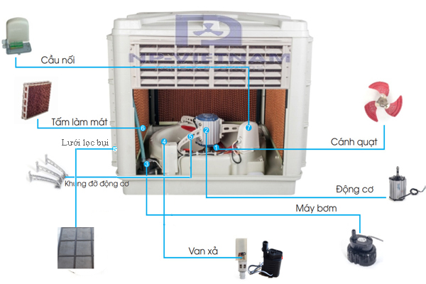 Máy làm mát công nghiệp được thiết kế thông minh, các bộ phận cấu thành nên máy có thể tháo rời tiện lợi cho việc vận chuyển đường dài cũng như thay thế. Đặc điểm, công dụng các bộ phận cấu thành lên máy gồm:
