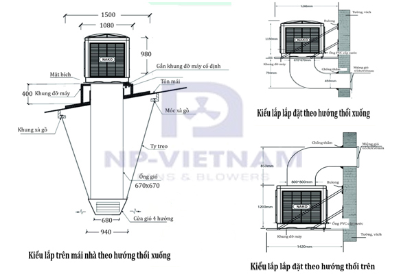 Hình ảnh: Mô hình lắp máy làm mát công nghiệp Nako Air Cooler 25000 thổi lên, thổi xuống