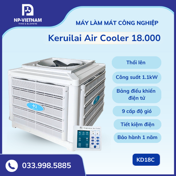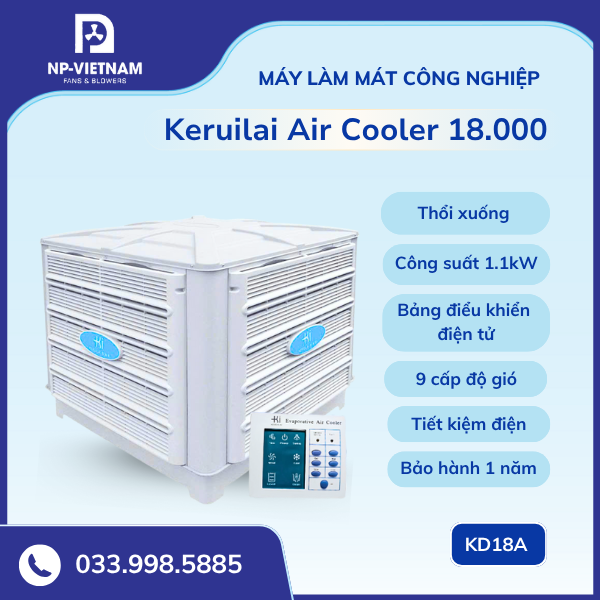 Keruilai Cooler KD18 là thiết bị làm mát công nghiệp được ưa chuộng hàng đầu tại Việt Nam. Với hiệu suất mạnh, độ bền cao và khả năng tiết kiệm điện vượt trội, sản phẩm đáp ứng mọi yêu cầu làm mát cho nhà xưởng, kho hàng, quán xưởng hoặc khu sản xuất quy mô lớn.