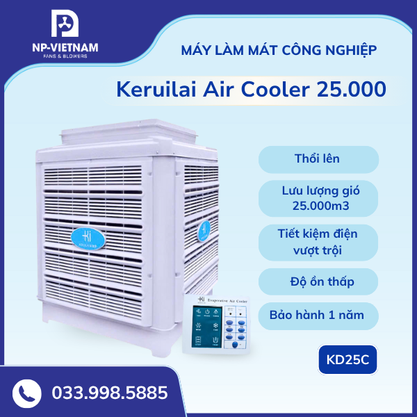 Keruilai air conditioner là giải pháp làm mát công nghiệp tối ưu cho nhà xưởng và kho hàng. Với model Keruilai KD25, lưu lượng 25.000 m³/h đem lại khả năng làm mát nhanh cho diện tích 120–150 m². Sản phẩm kết hợp hiệu suất cao, tiêu thụ điện thấp và vận hành êm, phù hợp dùng cho môi trường công nghiệp liên tục.