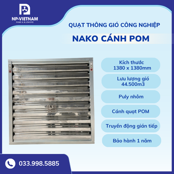 Quạt thông gió vuông cánh POM NAKO là thiết bị lý tưởng cho hệ thống thông gió công nghiệp. Với thiết kế hiện đại, vật liệu cao cấp và khả năng vận hành ổn định, sản phẩm mang lại hiệu suất làm mát mạnh mẽ, tuổi thọ lâu dài, giúp doanh nghiệp tiết kiệm năng lượng và chi phí bảo trì.