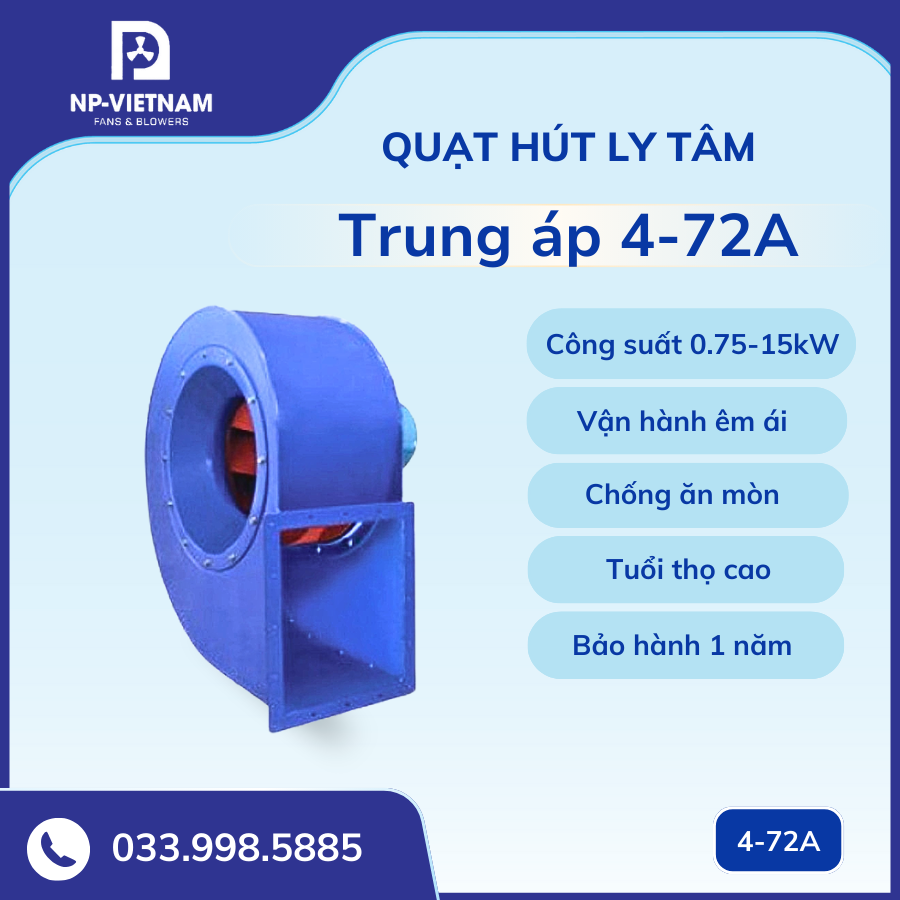 Quạt ly tâm 4-72A được thiết kế với cánh quạt chuyên dụng, tạo ra lưu lượng gió lớn và áp suất ổn định. Điều này đảm bảo khả năng thông gió mạnh mẽ, đáp ứng yêu cầu của nhiều ngành sản xuất.